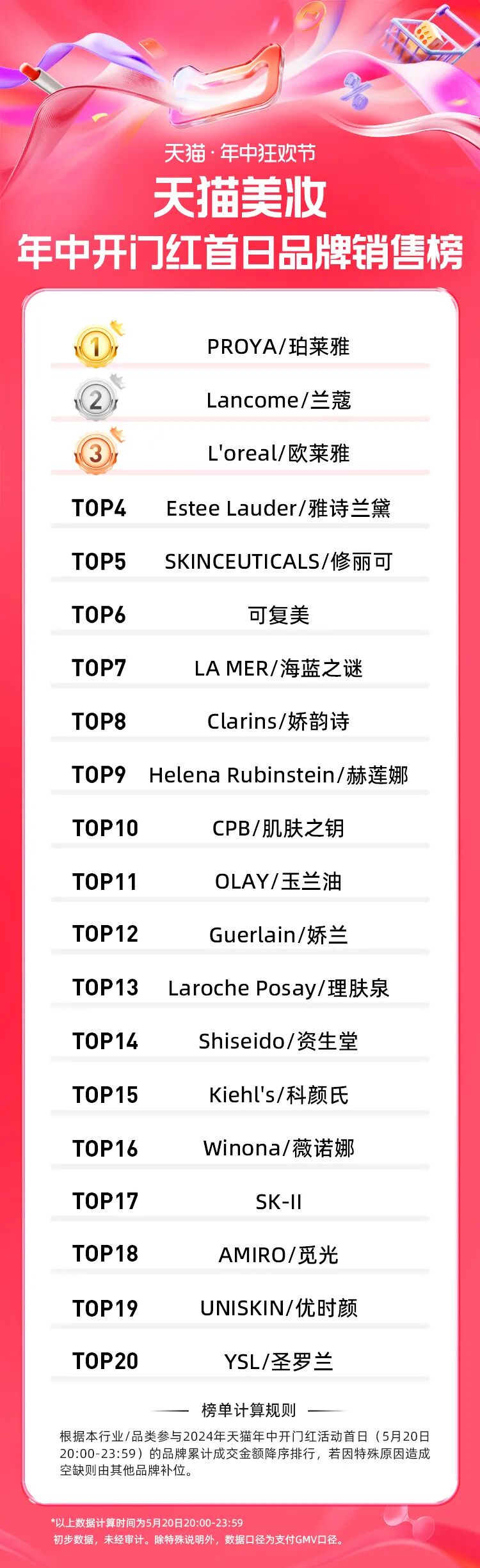 雅诗兰黛集团旗下其他品牌如MAC、海蓝之谜的部分产品也出现涨价,但也有倩碧等品牌下调了价格。欧莱雅集团旗下的兰蔻、科颜氏、植村秀等品牌部分产品也上调了价格,同时调整了赠品组合。或许是受促销力度调整的影响,从天猫官方披露的618首日美妆TOP20销售榜来看,今年618头部国货美妆的进步比国际美妆品牌更大。