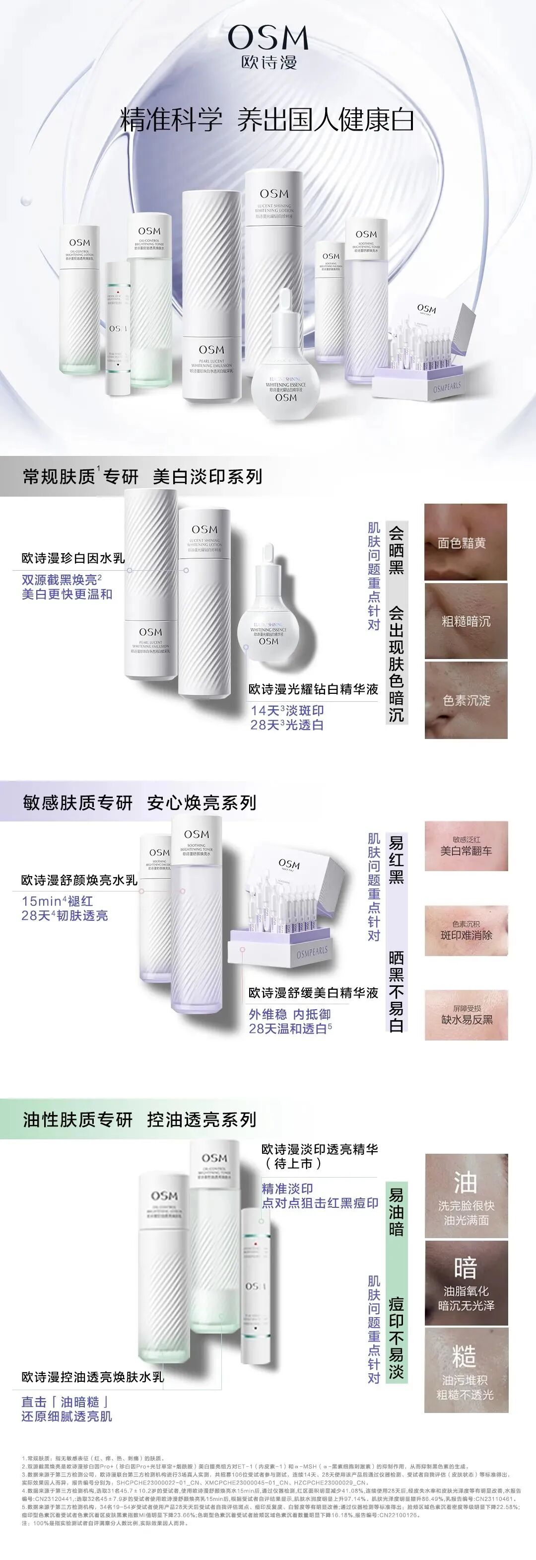 同时,欧诗漫也聚焦敏感性、常规性、油性肤质的美白进阶需求,率先提出了国人分肤美白的概念,通过精准分肤、精准靶点、精准配方,在产品开发上打造了3条分肤美白产品线,让不同肤质中国用户都可以精准科学健康美白,为美白功效性护肤品的发展高效赋能。