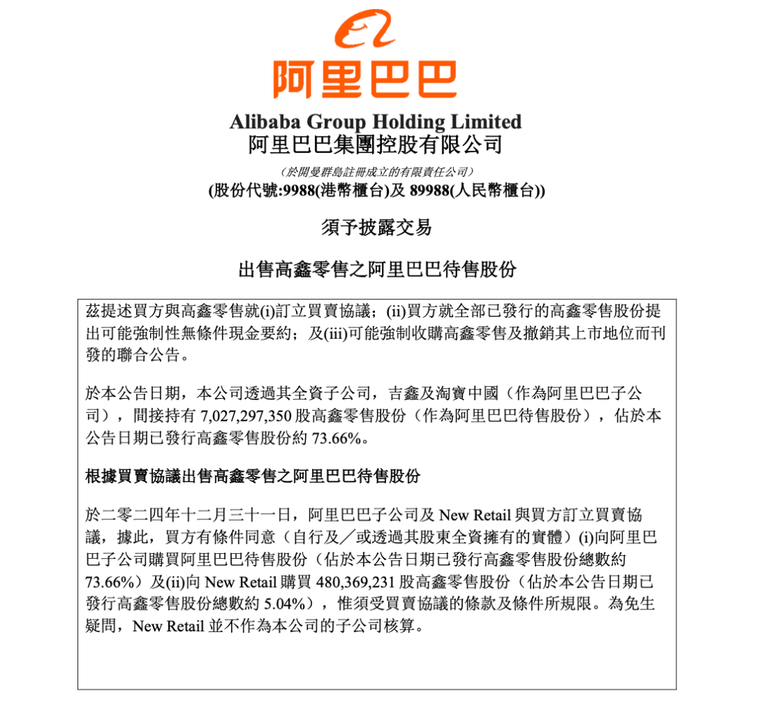 据蓝鲸新闻报道,2025年1月1日,阿里巴巴集团发布公告,宣布子公司及NewRetail与德弘资本达成交易,以最高约131.38亿港元(123.5亿元人民币)出售所持高鑫零售全部股权,合计占高鑫零售已发行股份的78.7%。预估出售事项所产生的股东应占损失约为131.77亿人民币。